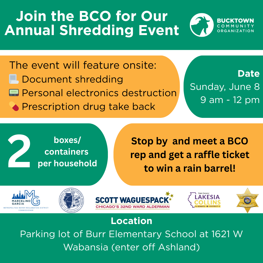 Join the BCO, Alderman Waguespack, and Illinois State Senator Lakesia Collins for FREE on-site document and electronics shredding and recycling.